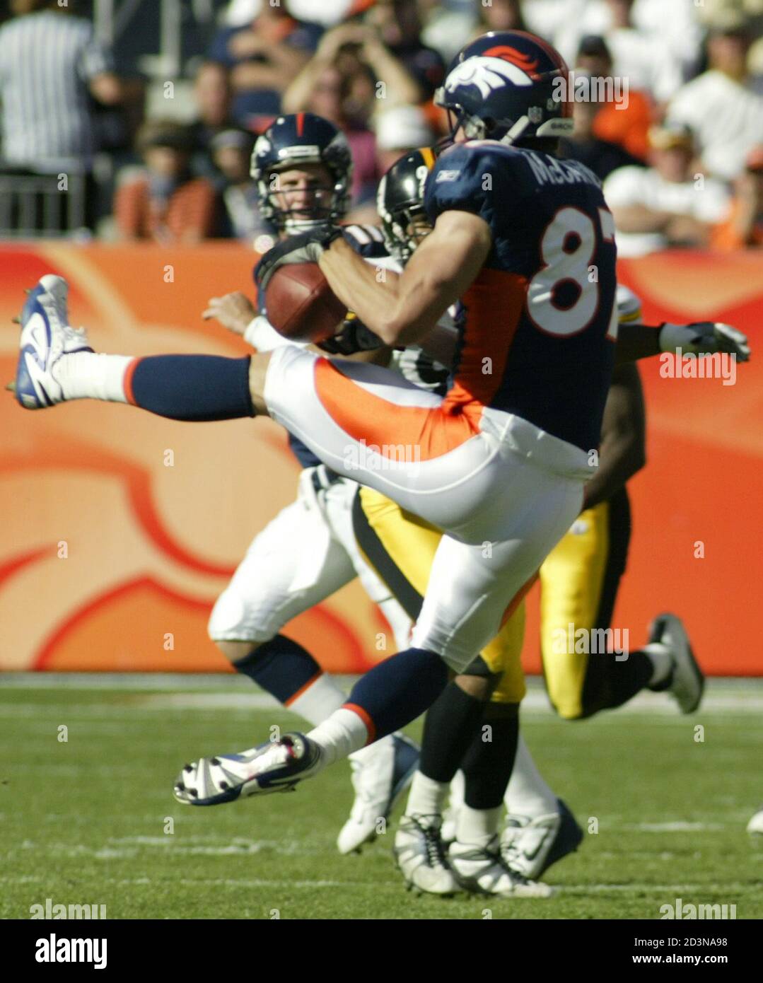 Denver Broncos Wide Receiver Ed Mccaffrey R Pulls In A 16 Yard Pass From Broncos Quarterback Steve Beuerlein In The Second Quarter Against The Pittsburgh Steelers In Denver October 12 2003 Beuerlein Started